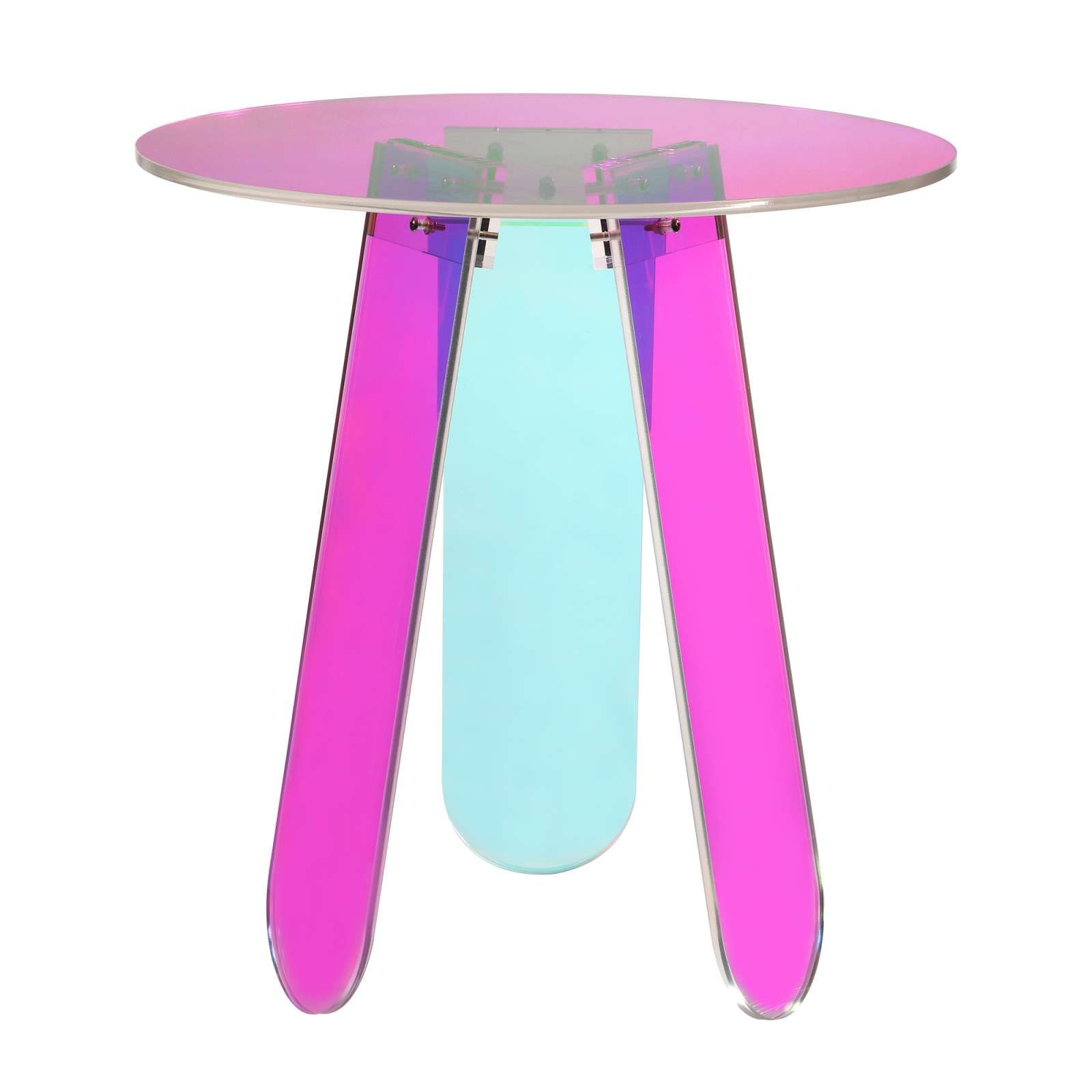 Originalan i moderan ovaj stol izrađen je od prozirnog iridescentnog akrila nudeći jedinstveni vizualni efekt koji se mijenja ovisno o kutu svjetlosti. Njegov jednostavan oblik i lagana konstrukcija čine ga svestranim dodatkom svakom interijeru savršeno se uklapajući u razne stilove uređenja. Idealan je za one koji traže prepoznatljiv i funkcionalan komad za svoj životni prostor.