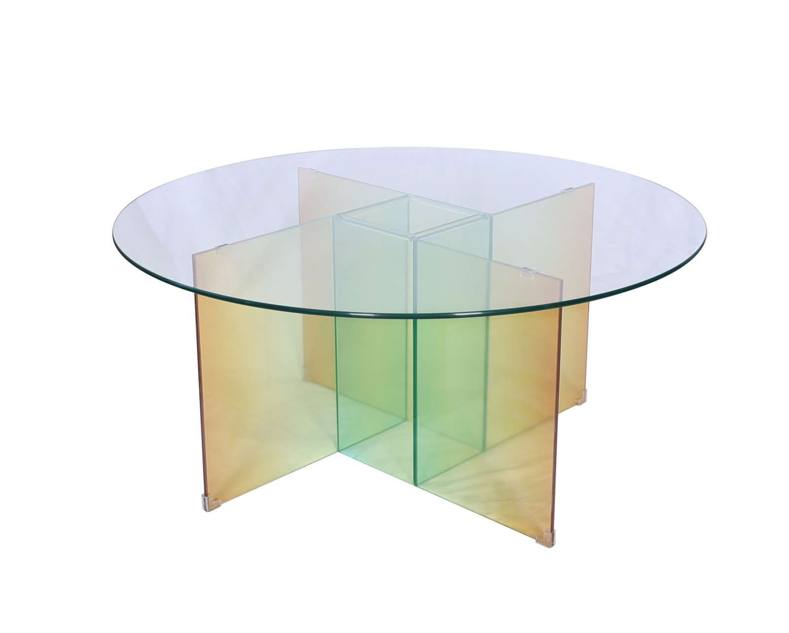 Oryginalni stolić za kavu izrađen od prozirnog kaljenog stakla ovaj komad nudi upečatljiv vizualni efekt sa svojom iridescentnom završnom obradom koja mijenja izgled ovisno o kutu svjetlosti. Njegov jednostavan oblik i elegantni detalji čine ga svestranim dodatkom koji se uklapa u svaki interijer. Stolić je djelomično sastavljen radi lakšeg postavljanja i dizajniran je da bude i funkcionalan i moderan.