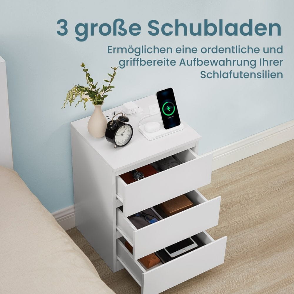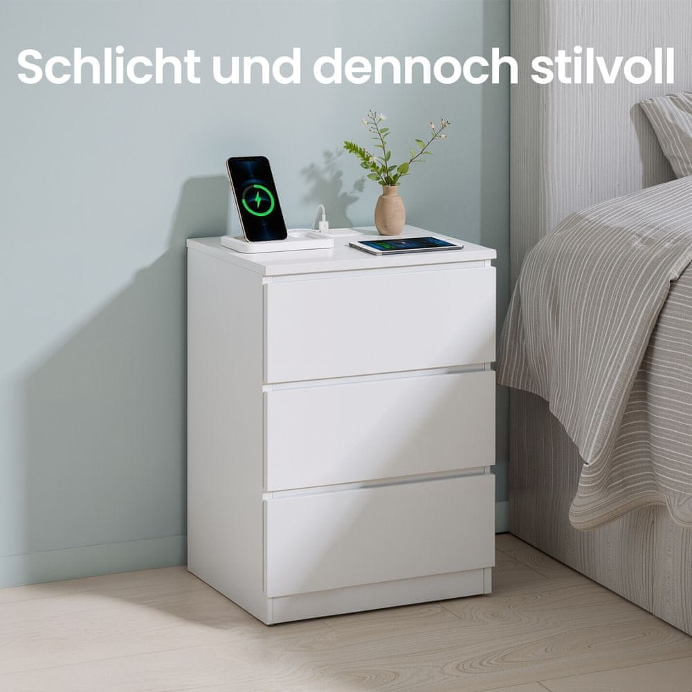 Ova moderna noćna ormarić nudi praktično rješenje za organizaciju vaših spavaćih potrepština istovremeno pružajući praktične opcije punjenja za vaše elektroničke uređaje. S tri prostrane ladice osigurava dovoljno prostora za pohranu a integrirana produžna utičnica s AC priključcima i USB-A portovima olakšava održavanje uređaja napunjenima. Elegantni završetak u boji oblačno bijele i suvremeni dizajn čine ga stilskim dodatkom svakom modernom interijeru.