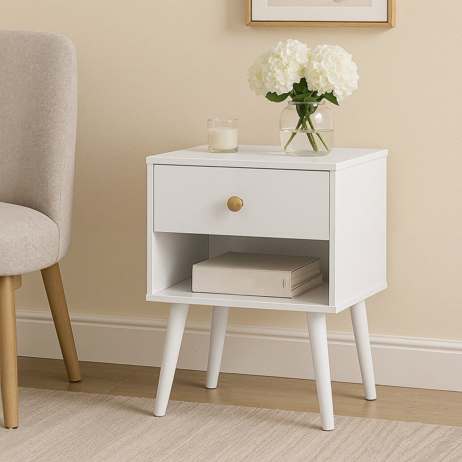Ovaj set od dva noćna ormarića nudi praktično i elegantno rješenje za organizaciju vašeg dnevnog boravka ili spavaće sobe. Svaki ormarić ima ladicu i otvorenu policu koja pruža praktičan prostor za pohranu svakodnevnih potrepština. Moderan dizajn s čvrstim drvenim nogama osigurava funkcionalnost i bezvremenski izgled prikladan za različite stilove interijera.