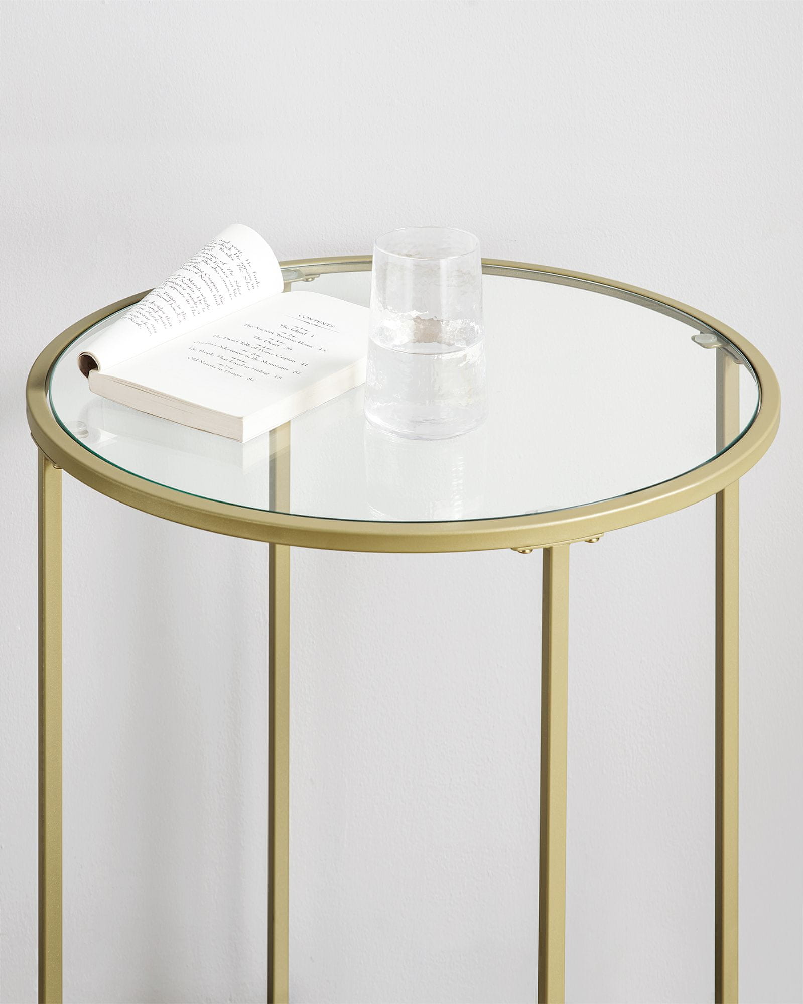 Ovaj elegantni okrugli pomoćni stolić ima površinu od kaljenog stakla i čvrst metalni okvir, dodajući dašak sofisticiranosti svakoj dnevnoj ili spavaćoj sobi. Savršen za izlaganje dekoracija ili odlaganje omiljenog pića, spaja stil i stabilnost za svakodnevnu upotrebu.