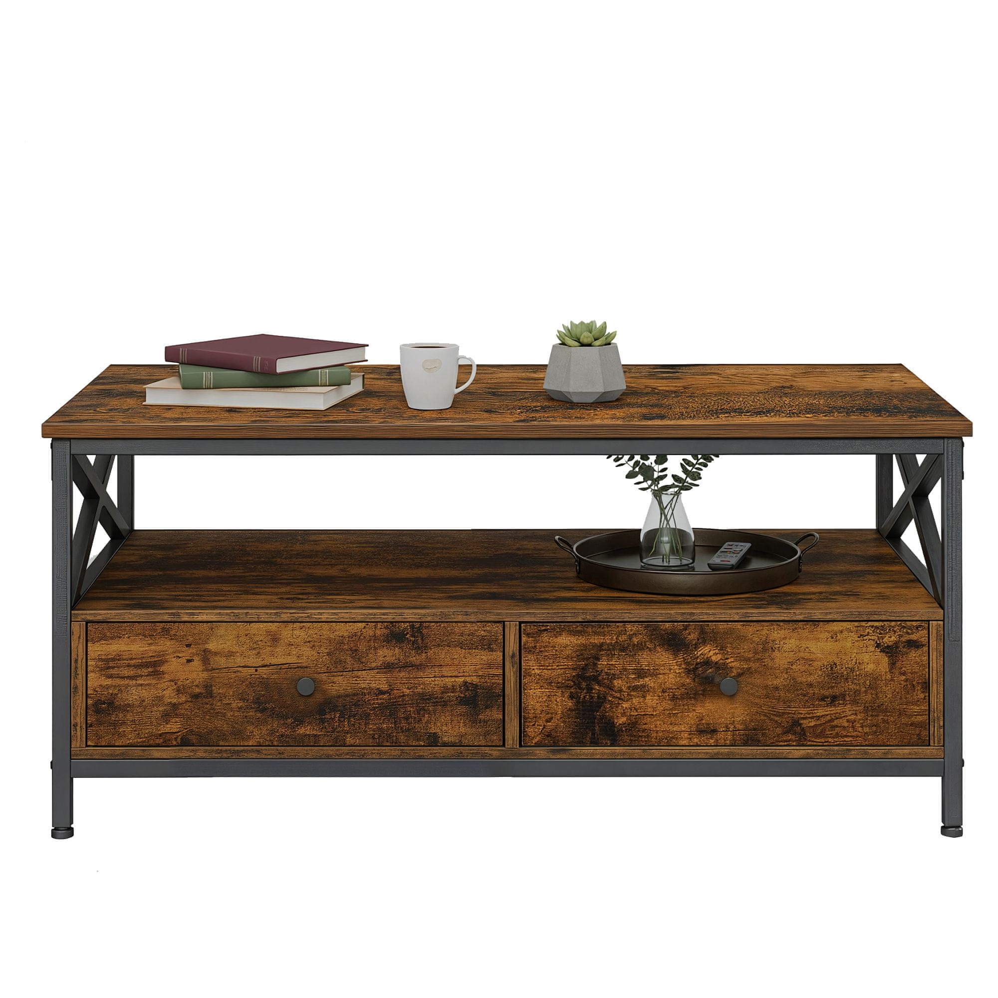 Ovaj stolić za kavu ima moderan industrijski dizajn s praktičnim opcijama za pohranu uključujući ladice i otvorenu policu. Savršen za organizaciju osnovnih stvari u dnevnom boravku uz dodavanje vintage šarma vašem kućnom dekoru.