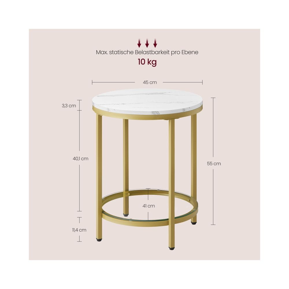 Ovaj moderni bočni stol dizajniran je da upotpuni dnevne sobe radne prostore ili male prostore nudeći i stil i funkcionalnost. Njegova dvokatna konstrukcija pruža dovoljno prostora za postavljanje osnovnih stvari što ga čini prikladnim kao noćni ormarić ili ukrasni stol. Elegantna površina u izgledu mramora i čvrsti okvir osiguravaju da se besprijekorno uklopi u suvremene interijere.