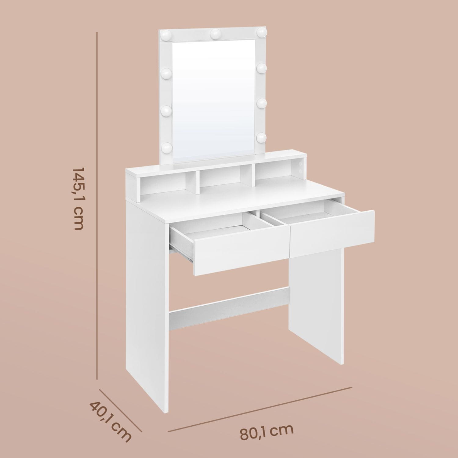 Ovaj moderni toaletni stol ima ogledalo s osvjetljenjem, prostrane ladice i otvorene pregrade, što ga čini idealnim za organizaciju šminke i kozmetičkih potrepština. Savršen za dodavanje stila i funkcionalnosti vašoj spavaćoj sobi ili prostoru za presvlačenje.