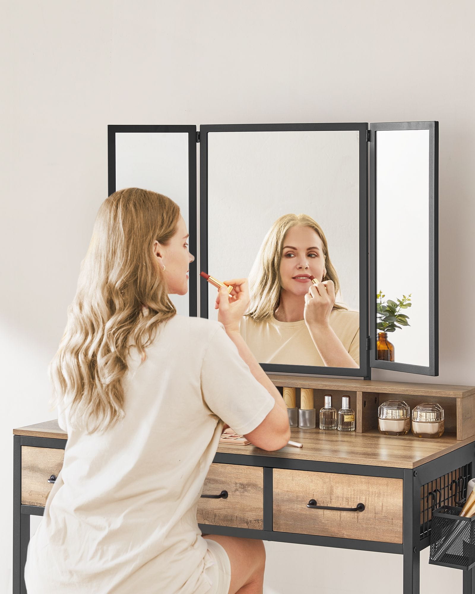 Ovaj toaletni stolić pruža dovoljno prostora za pohranu i organizaciju vaših kozmetičkih potrepština, s više pretinaca i trostrukim preklopnim ogledalom za svestranu upotrebu. Njegov moderan industrijski dizajn unosi suvremeni štih u svaku spavaću sobu ili prostor za presvlačenje.