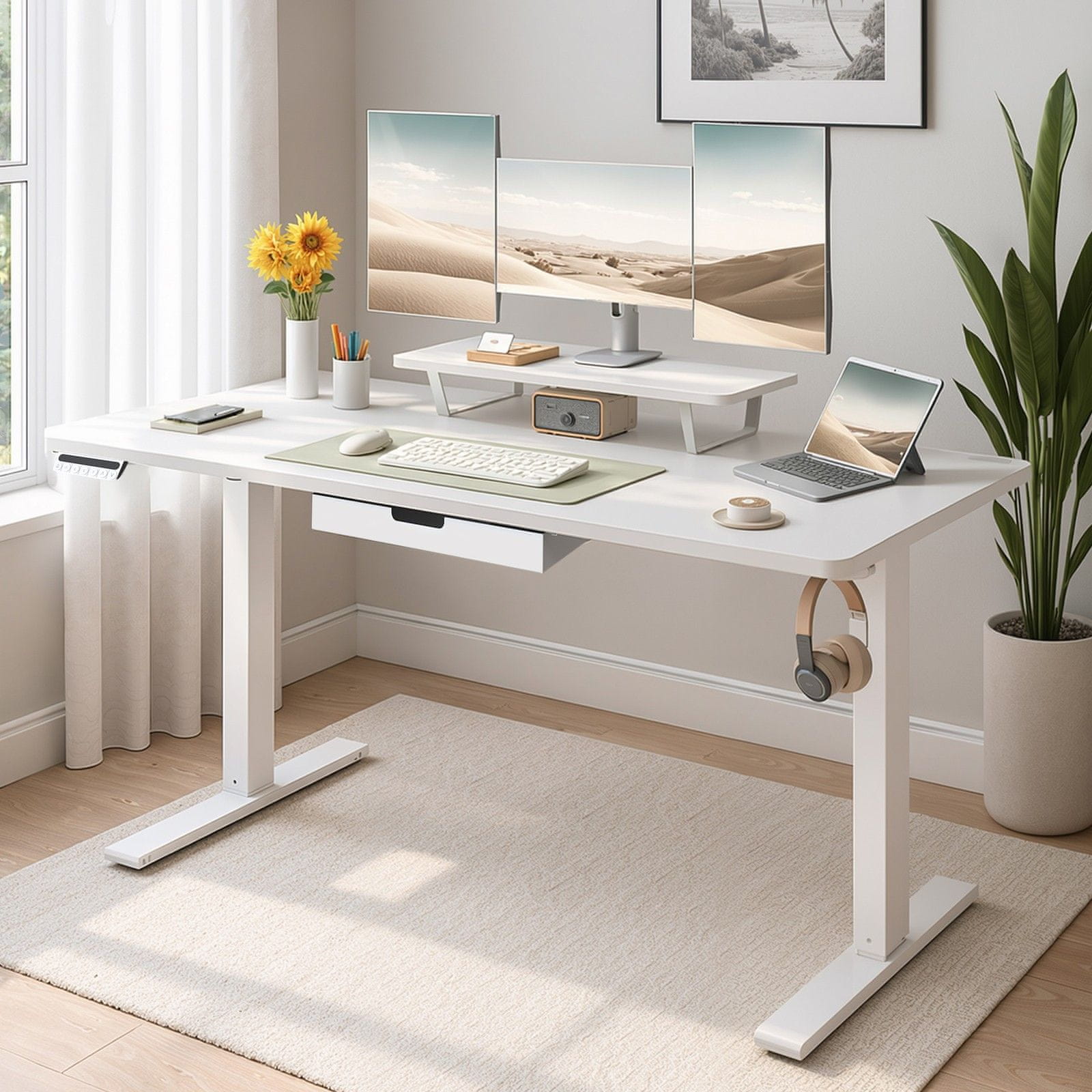 Ova stolna radna površina podesive visine dizajnirana je za pružanje fleksibilnog i ergonomskog radnog prostora što je čini idealnom za uredske okoline. Ima svestrani stalak za monitor praktični ladicu i moderne opcije povezivanja za povećanje produktivnosti i udobnosti tijekom dugih radnih sati. Stol s čistim bijelim završetkom i čvrstom konstrukcijom osigurava stil i trajnost.