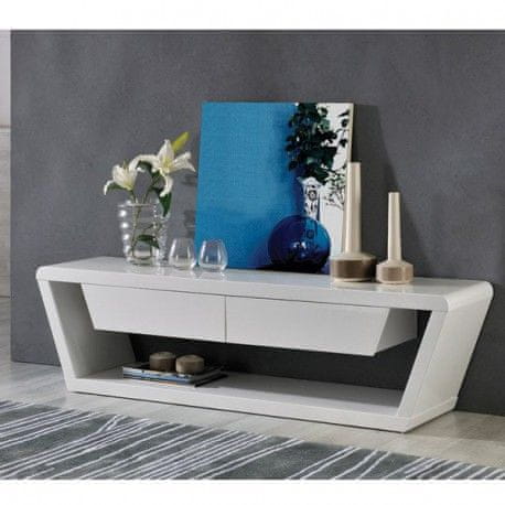 Moderna TV komoda bijele boje od MDF materijala. Komoda sadrži 2 ladice za pohranu stvari