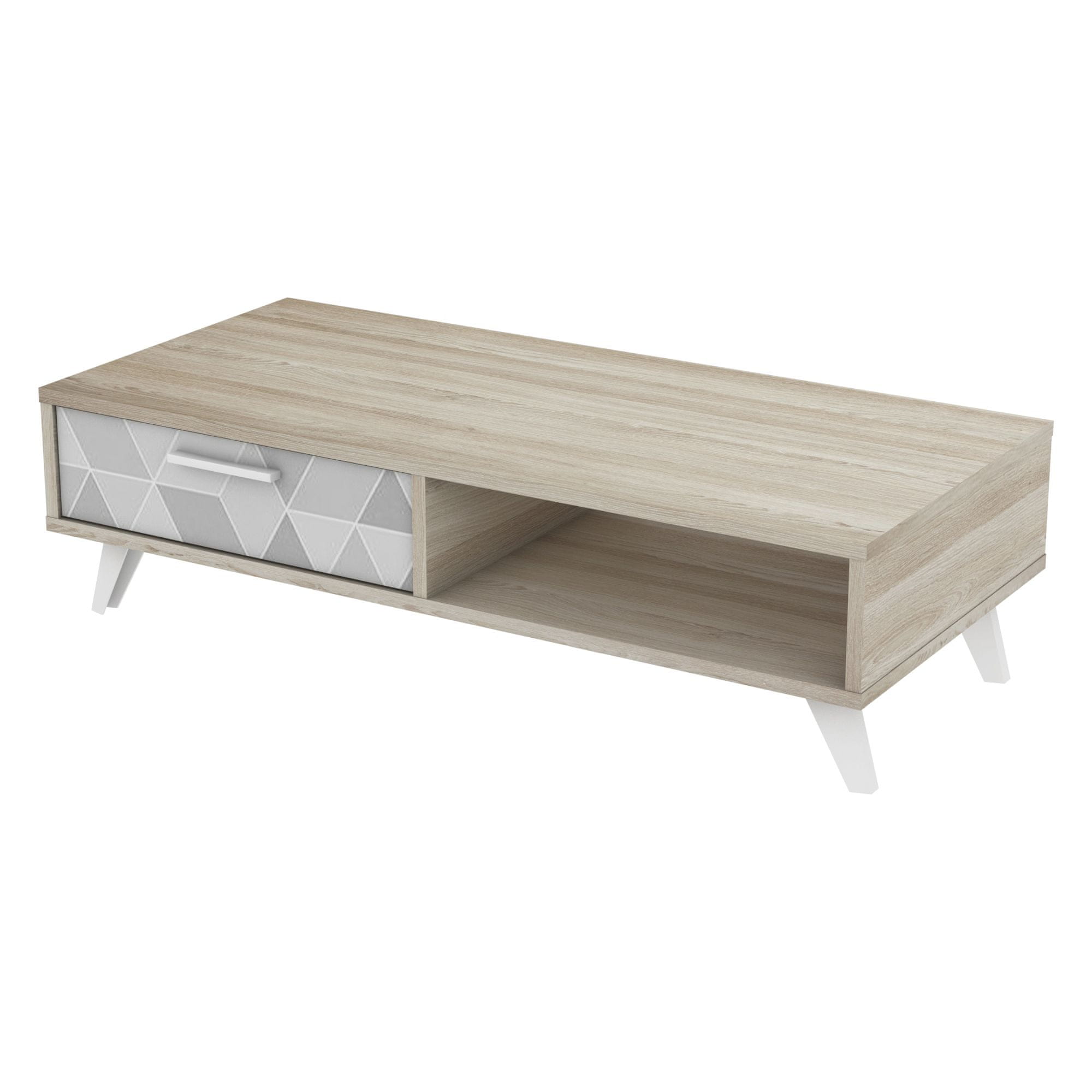 Klupski stol u skandinavskom stilu kombinira moderan izgled i praktičnost. Svijetli tonovi i jednostavan dizajn omogućuju lako stapanje sa bilo kojim stilom u vašem domu. Ima moderan geometrijski ispis. Stol pruža puno prostora za skladištenje jer ima ladicu dimenzija 48 × 9 × 39 cm s jedne strane i policu dimenzija 51 × 14 × 50 cm s druge. Ladica se otvara plastičnom ručkom, a sam stol stoji na četiri također plastične noge u bijeloj boji. Klupski stol izrađen je od iverice debljine 1,5 cm i 1,8 cm.