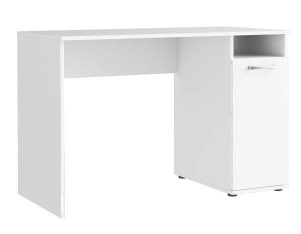 Kompaktni stol s desne strane ima ormarić s ručkama u aluminijskoj boji. Iznad ormarića je mala otvorena polica.