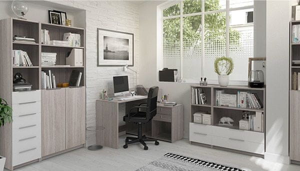 Kutni radni stol u L obliku, koji se može montirati na lijevu i desnu stranu. Moderan je i praktičan, jer nudi opsežnu radnu površinu. Dostupan je u imitaciji hrast. Ima dvije ladice koje se otvaraju klasičnim metalnim vodilicama i imaju sive, plastične ručke. Stol ima četiri prostrane police, koje omogućuju puno prostora za odlaganje. Stol također ima podignute bočne rubove koji sprječavaju padanje stvari sa stola.