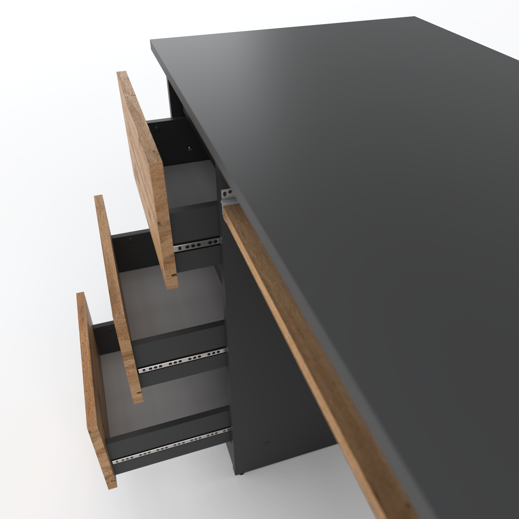 Industrijski stil stola sa sivim korpusom i frontom od hrasta Wotan kombinira strogost s prirodnom toplinom, stvarajući jedinstveni komad namještaja idealan za moderne interijere. Sivi korpus naglašava minimalističku i cool estetiku, dok prednja strana u Wotan hrastu uvodi elemente prirode, dajući cijeloj stvari ugodan i skladan izgled.