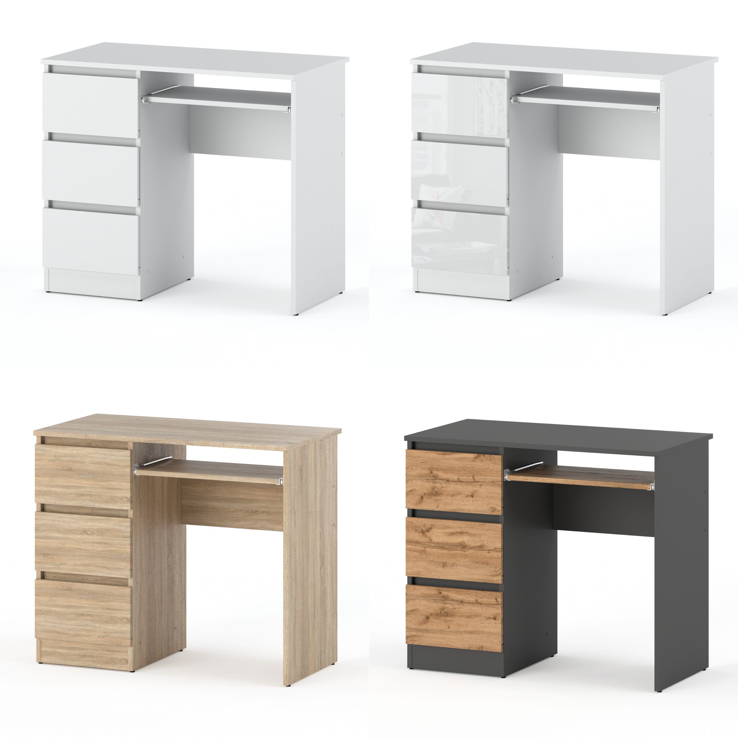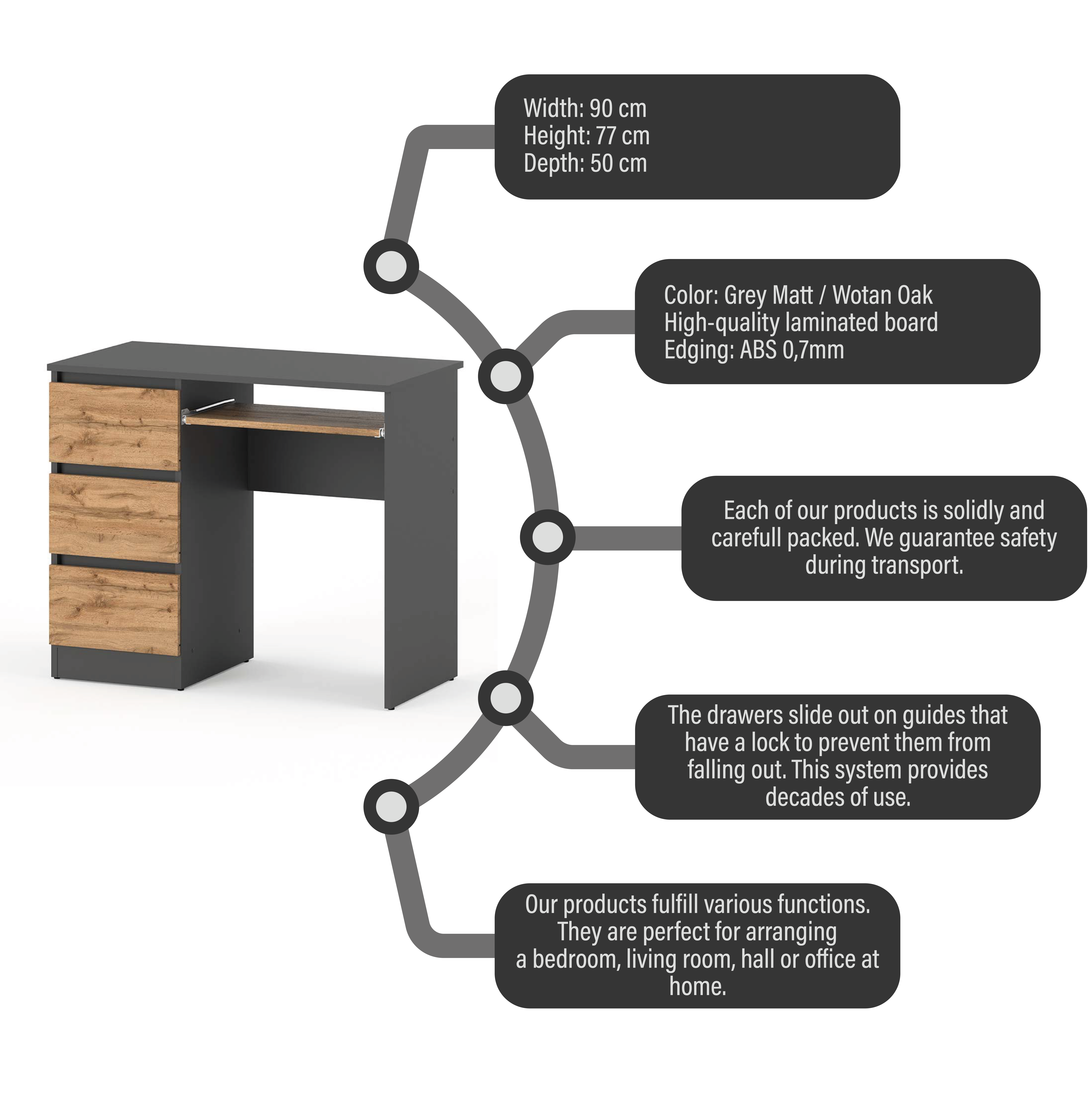 Računalni stol s 3 ladice 90 CM Sivi hrast Wotan Školski gaming potkrovlje Računalni stol 90 cm savršen je izbor za ljude koji traže funkcionalno i elegantno mjesto za igru, rad ili učenje.