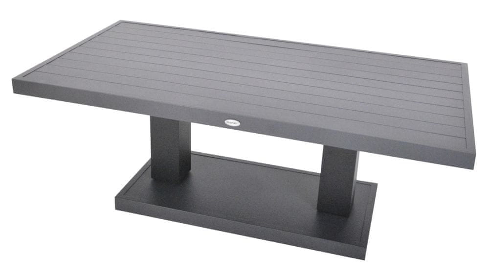 Luksuzna garnitura Budapet u grafitnoj završnici spaja izdržljivu aluminijsku konstrukciju i elegantne naslone za ruke od tikovine. Posebnost kompleta je aluminijski stol s podesivom visinom ploče, koju možete jednostavno prilagoditi na 51 cm ili 77 cm te ga koristiti kao klub stolić ili blagovaonski stol. Moderan dizajn omogućuje savršeno uklapanje u svaki vanjski ili unutarnji prostor.