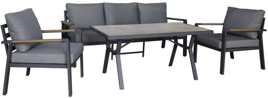 | Materijal | Konstrukcija od grafitnog aluminija, ploča stola od aluminija i smole AH02, tamnosivi jastuci od predene tkanine (poliester) |