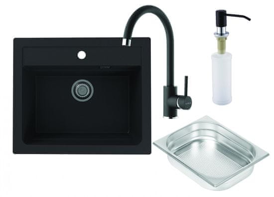 Alveus Set Atrox 30 u karbon boji sastoji se od umivaonika Atrox 30, kuhinjske armature (slavina) Roxa, dozatora deterdženta Callas i posude za cijeđenje.
