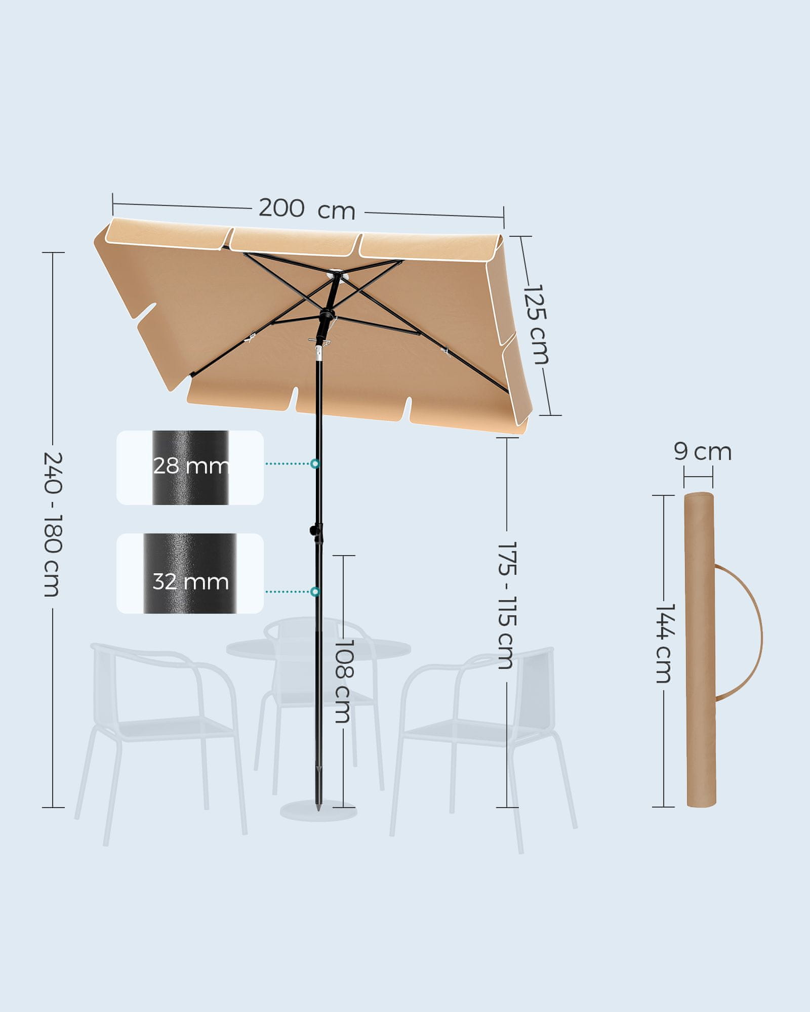 Ovaj pravokutni balkonski suncobran dizajniran je za optimalnu zaštitu od sunca i udobnost na vašim vanjskim prostorima poput balkona terasa ili vrtova. Njegova podesiva tenda omogućuje vam prilagodbu sjene prema položaju sunca osiguravajući ugodno i opuštajuće iskustvo tijekom cijelog dana. Suncobran je jednostavan za transport i montažu što ga čini idealnim za korištenje kod kuće i na plaži.