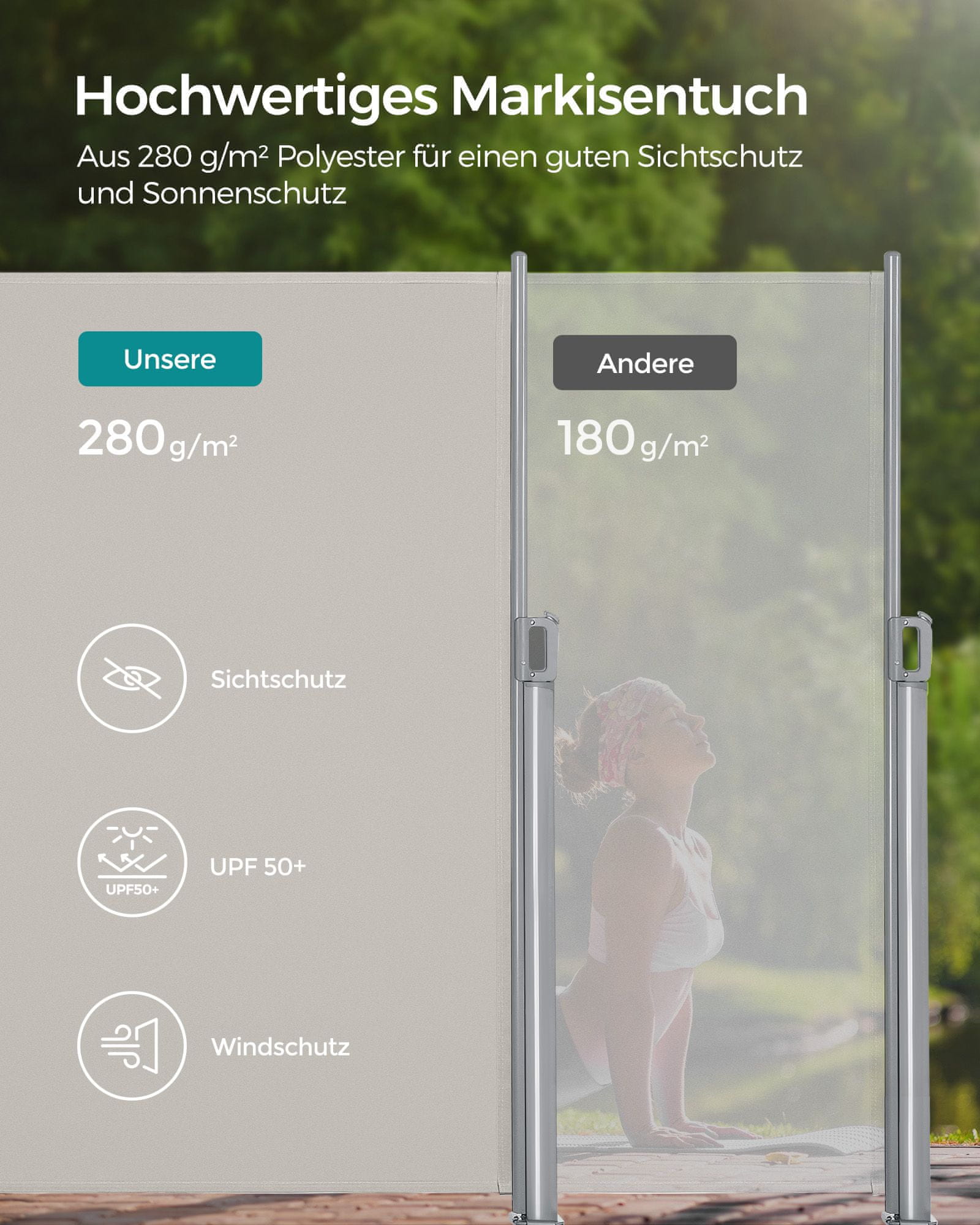 Ova bočna tenda pruža učinkovitu privatnost i zaštitu od sunca za vaš balkon, terasu ili vrt. Njena izdržljiva konstrukcija osigurava dugotrajnu upotrebu, povećava udobnost na otvorenom i štiti od vjetra i UV zraka.