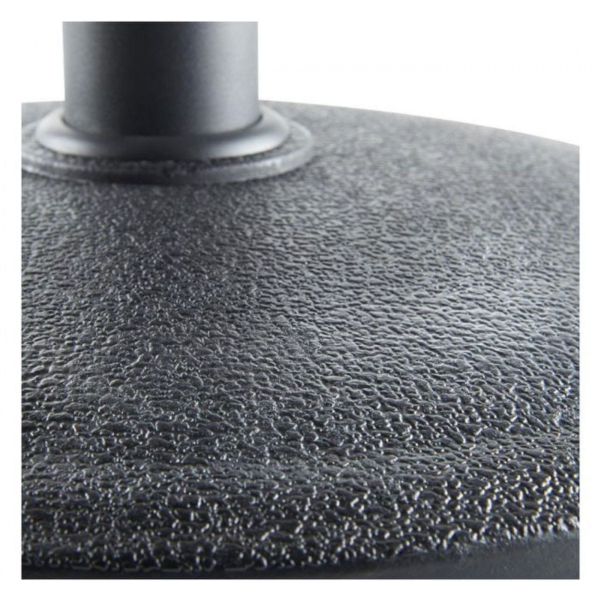 Izuzetno je izdržljiv, jer je izrađen od poliuretanske smole, a omogućuje i jednostavno održavanje. Ima podesivi vijak za cijevi manjeg promjera, a težina baze je upravo točna kako bi se omogućilo lako kretanje po vrtu, a istovremeno osigurava da suncobran ostane na svom mjestu.