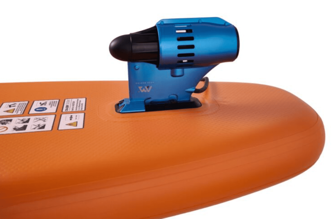 Lagani SUP na napuhavanje, dimenzija 320 × 81 × 15 cm i nosivosti do 140 kg, idealan je za izlete po mirnim, nemirnim vodama. Njegove posebne značajke su električni motor Power Fin i daljinski upravljač, koji omogućuje vožnju bez veslanja.