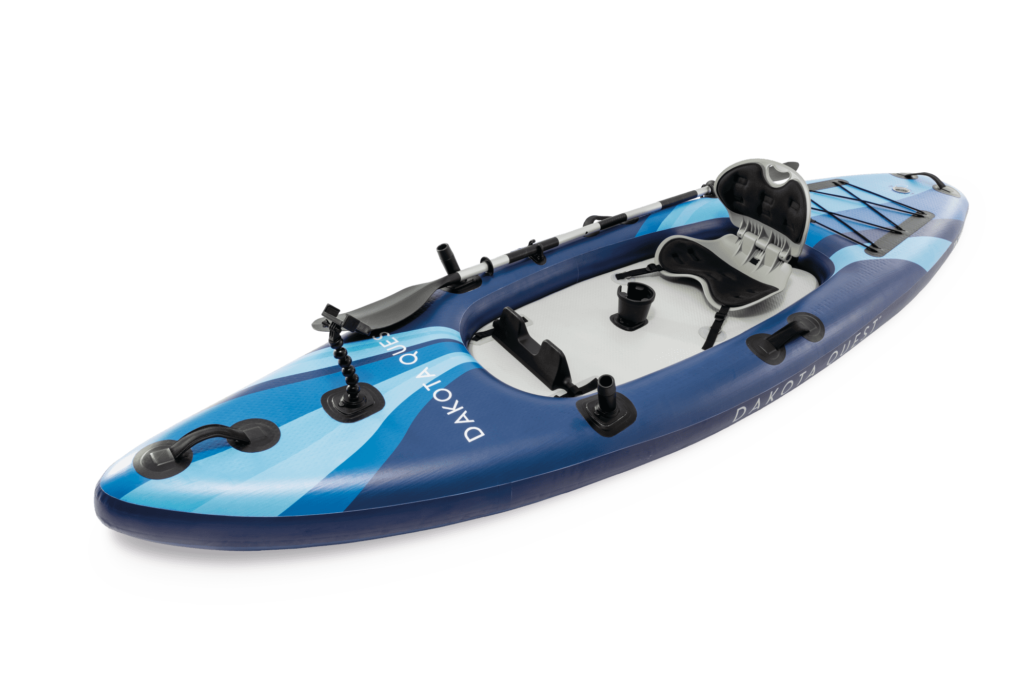 Dakota Quest™ Sit-on-top je inovativan kajak na napuhavanje koji se može koristiti i kao SUP daska. S Drop Stitch tehnologijom i dimenzijama od 320 × 89 × 20 cm, nudi vrhunsku stabilnost i nosivost do 160 kg. Opsežan set uključuje udobno sjedalo, držače za štap za pecanje i telefon, veslo, pumpu i ruksak.