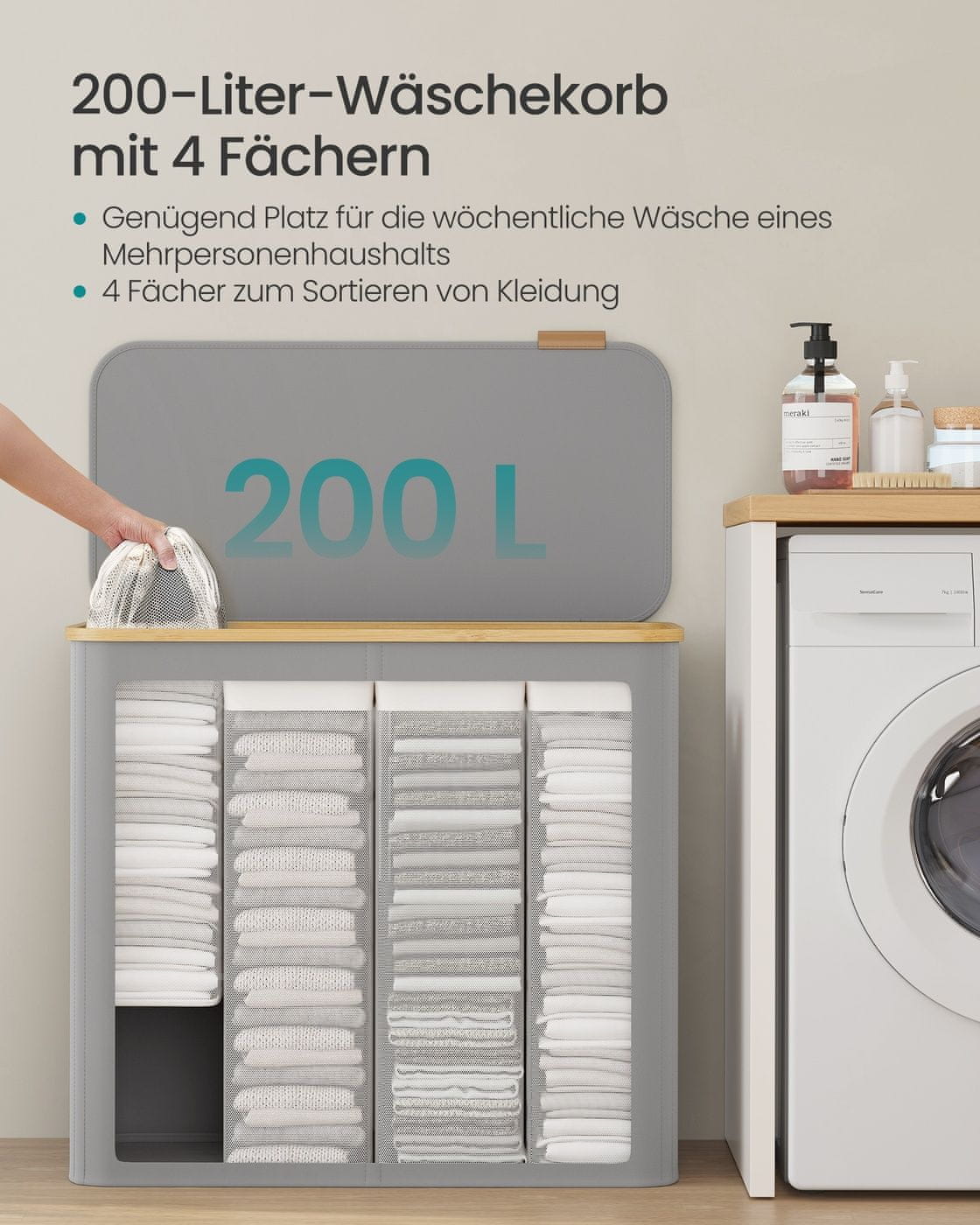 Ova košara za rublje ima uklonjivu podstavu i poklopac za organizirano i skriveno spremanje rublja. Sklopivi dizajn omogućuje jednostavno spremanje, dok čvrste ručke osiguravaju praktičan prijenos. Idealna za održavanje vašeg doma urednim i bez nereda.