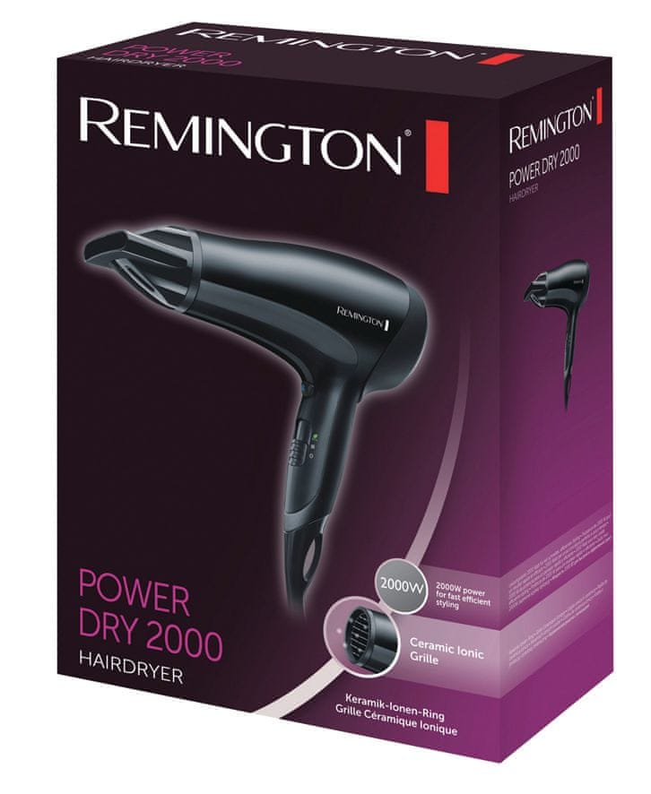 Sušilo za kosu Remington D3010 Power Dry 2000 s 2000 W snage i keramičkom ionsko mrežicom, koncentratorom i difuzorom.