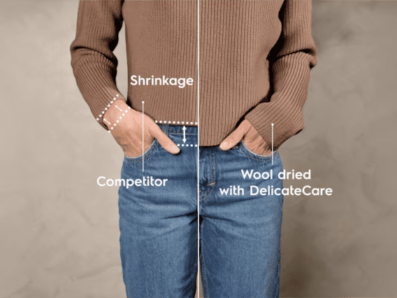 DelicateCare sustav prilagođava temperaturu sušenja i kretanje bubnja posebnim tkaninama kao što je vuna. Tako sprječava skupljanje i gubitak oblika, čak i kod osjetljivih tkanina.