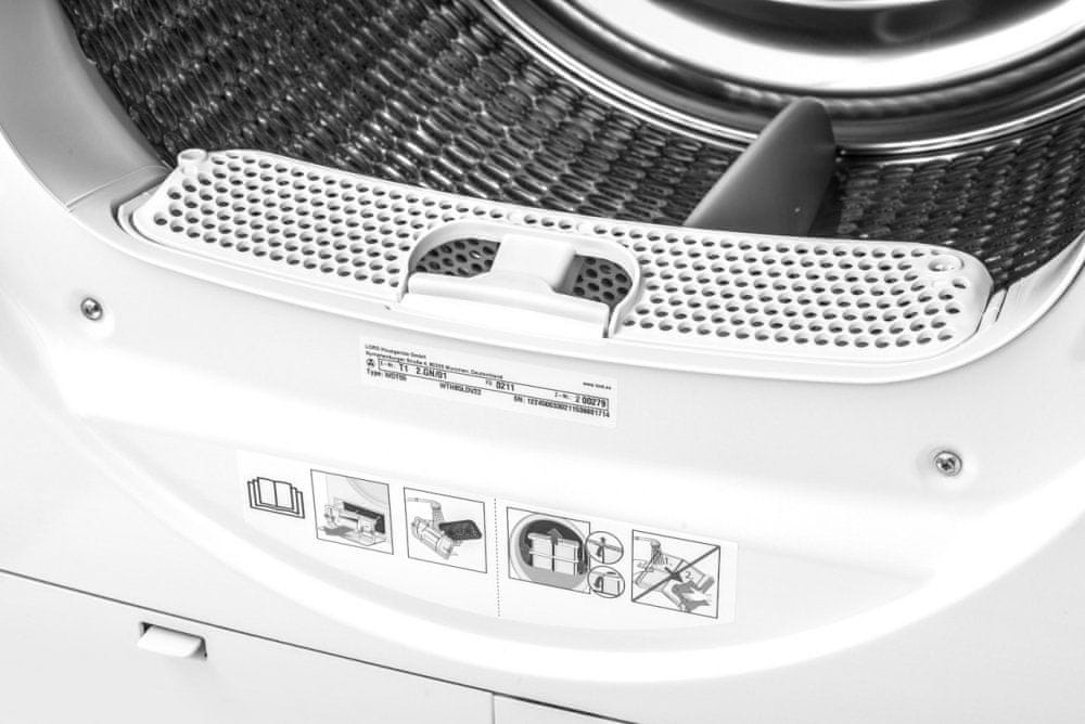 Možete birati između četrnaest programa koji su osmišljeni tako da zadovolje vaše želje i vrste tkanina. Nudi iznimno jednostavan odabir programa i dodatnu prilagodbu sušenja na ekranu osjetljivom na dodir. Pregledan LCD zaslon omogućuje kontrolu procesa sušenja s informacijama o odabranom načinu sušenja i preostalom vremenu. Sušilica je opremljena senzorima koji detektiraju kada je rublje suho i prema tome prilagođavaju vrijeme sušenja. Tijekom sušenja možete jednostavno zaustaviti program, zamijeniti ili dodati zaboravljeno rublje. Trostruka filtracija hvata više nečistoća, uključujući dlake kućnih ljubimaca, i tako osigurava stvarno svježe rublje. Možete isključiti zvučno upozorenje o kraju programa ili podesiti njegovu glasnoću.