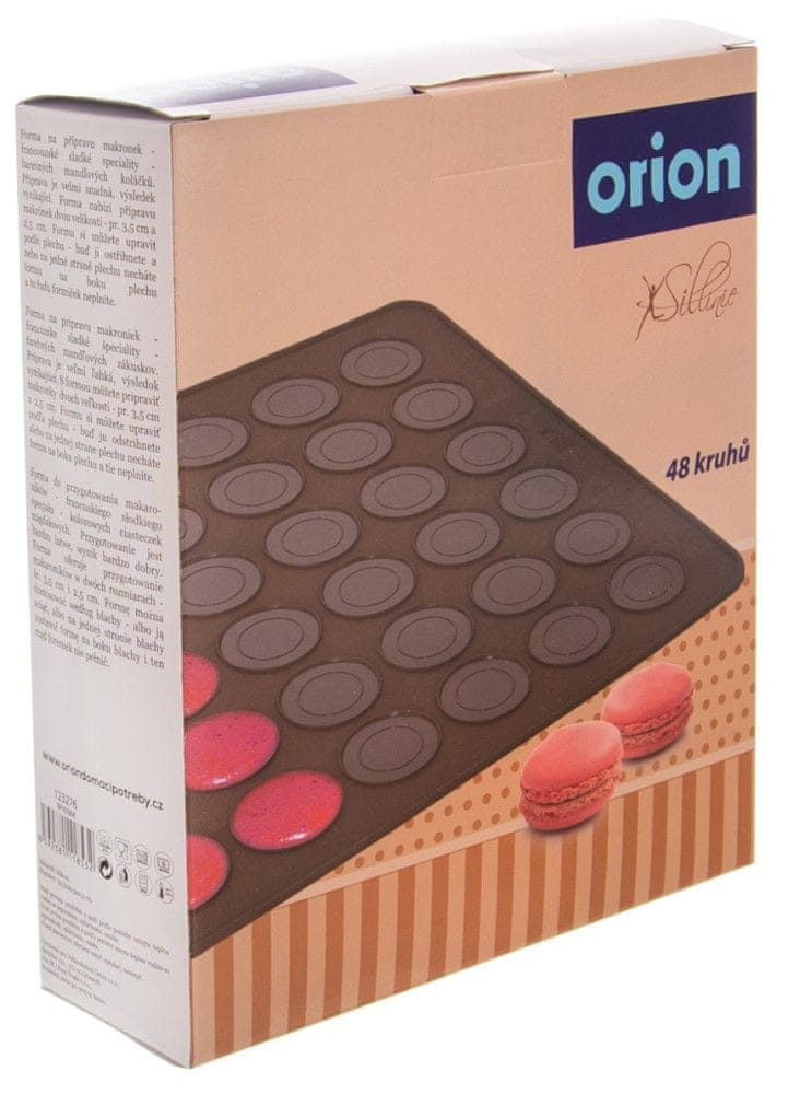 Sa silikonskim modelom marke Orion pečenje je jednostavno. Uz njega ćete uz najmanje truda stvoriti prekrasne i ukusne Macarons promjera 3,5 i 2,5 cm. Kalup traje temperature do 220 °C podnosi mirise i okuse hrane i može se prati u perilici posuđa. Cijeli opis