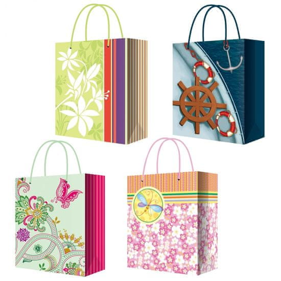 Vrsta: ukrasne vrećice. U setu: 1× vrećica. Veličina raširene vrećice: 33×10.2×45.7 cm. Materijal izrade: kartonaža za pojačanim dnom. Ručka: traka u boji. Grafika: razni motivi. Dob: 3+. Sorto: više vrsta na izbor. Cijena za jedna proizvod.