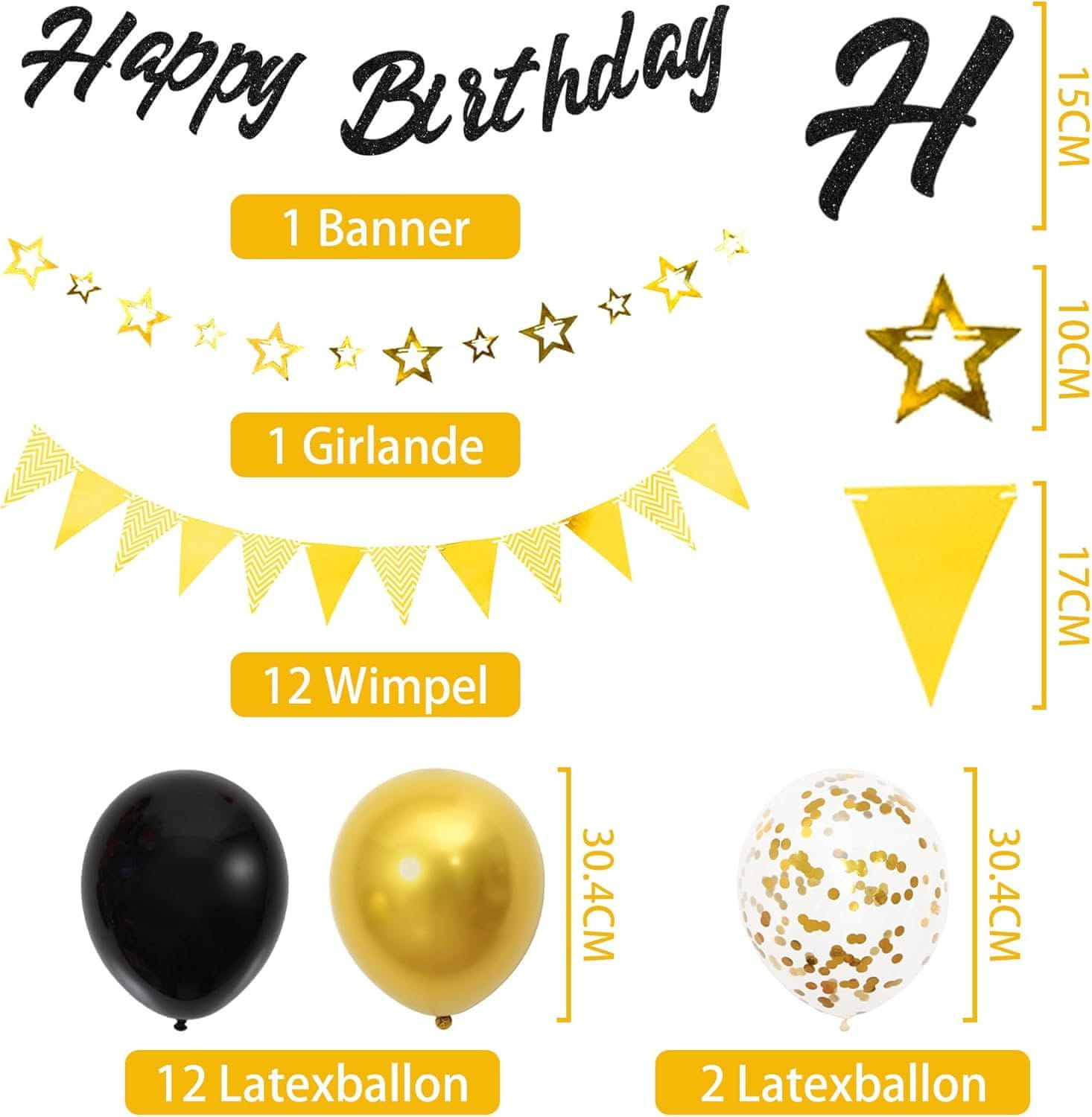 - Sadržaj seta: 1 crni banner „Happy Birthday”, 1 girlanda sa zvijezdama, 12 zastavica, 5 folija balona u obliku zvijezde, 4 spiralna privjeska, 12 lateks balona, 2 balona s konfetima i 1 dekoracija za tortu.