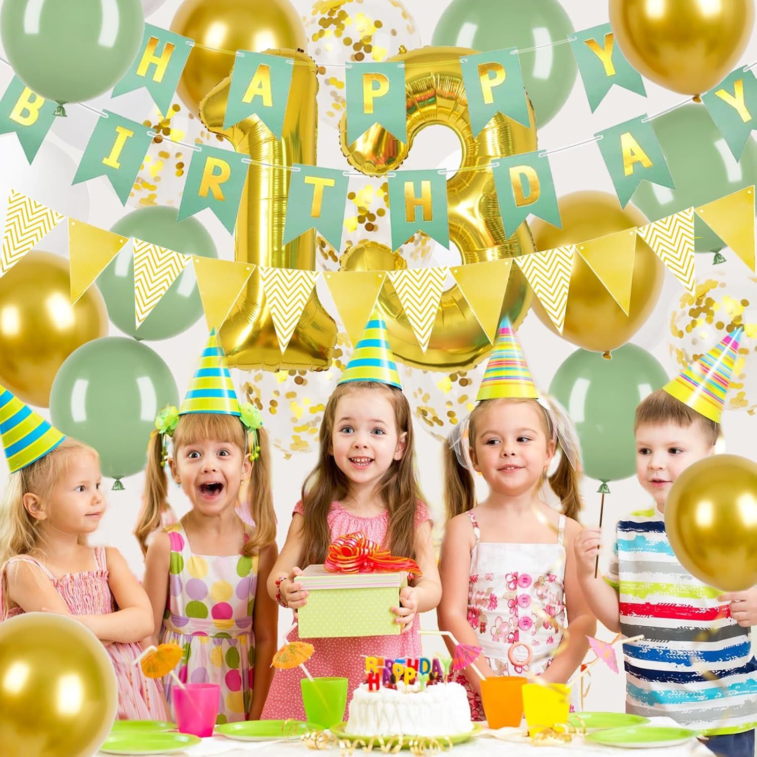 Nikcorp Set dekoracija za 13. rođendan, veliki komplet za dječake i djevojčice s banerom i balonima, zlatni, bijeli, zeleni