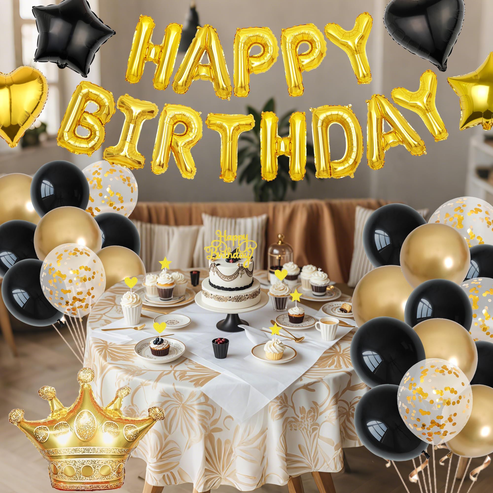 Nikcorp Set rođendanskih dekoracija baloni i girlanda Happy Birthday, crno-zlatni komplet ukrasa sa zavjesom, stolnjakom i topperima