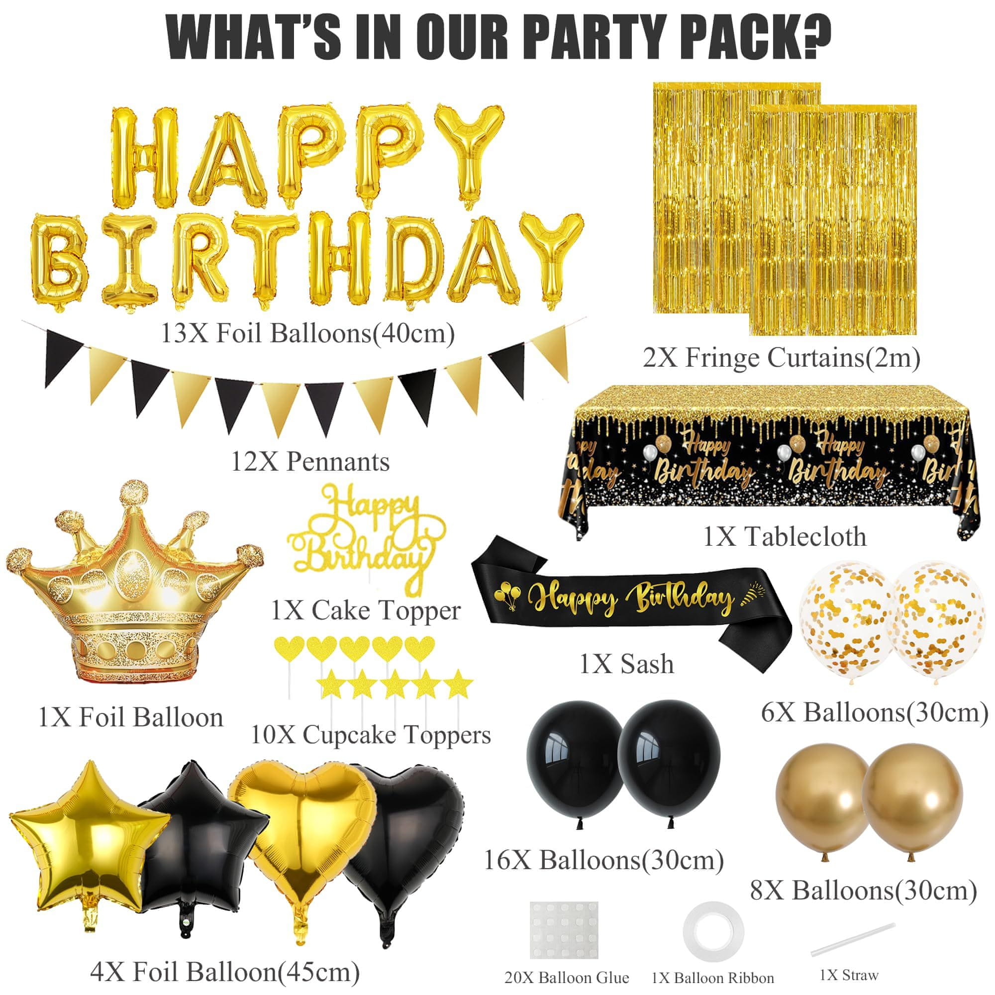 Ovaj elegantni set rođendanskih dekoracija u crno-zlatnoj boji predstavlja cjelovito rješenje za kreiranje upečatljivog ambijenta na proslavama. Komplet je dizajniran kako bi omogućio koherentan i vizualno privlačan aranžman prostora, pogodan za proslave rođendana odraslih osoba, godišnjice ili druge posebne prigode. Set sadrži širok raspon elemenata, od balona i girlandi do dekoracija za tortu i stolnjaka, čime se osigurava sveobuhvatno uređenje dvorane, stola i prostora predviđenog za fotografiranje. Crno-zlatna shema boja pruža dekoracijama moderan i luksuzan karakter, stvarajući ugodno ozračje koje će oduševiti sve prisutne goste te osigurati profesionalan izgled vašeg događaja uz minimalan trud prilikom postavljanja.