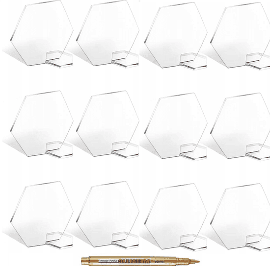 Stvorite nezaboravnu atmosferu na svom vjenčanju uz pomoć šesterokutnih akrilnih pločica s postoljima. Izrađene od prozirnog akrila, ove se pločice savršeno uklapaju u svaki dekor stola zahvaljujući svom minimalističkom dizajnu. Pločice su prazne, što vam daje potpunu slobodu umjetničkog izražavanja – možete po njima pisati, slikati krednim bojama ili sprejevima, stvarajući individualne i trajne dekoracije. Svaka pločica opremljena je zaštitnom folijom koju je potrebno ukloniti prije upotrebe. Zahvaljujući površini koja se lako čisti, pločice se mogu koristiti više puta za razne prigode, kao što su proslave rođenja djeteta (baby shower), korporativni banketi ili konferencije. Set uključuje 25 komada pločica, što omogućuje organizaciju i označavanje mjesta za sve goste.
