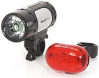 Komplet svjetala za bicikl uključuje prednje svjetlo s ugrađenim brzinomjerom, kontroler sirene, odašiljač brzinomjera i senzor te stražnje svjetlo.