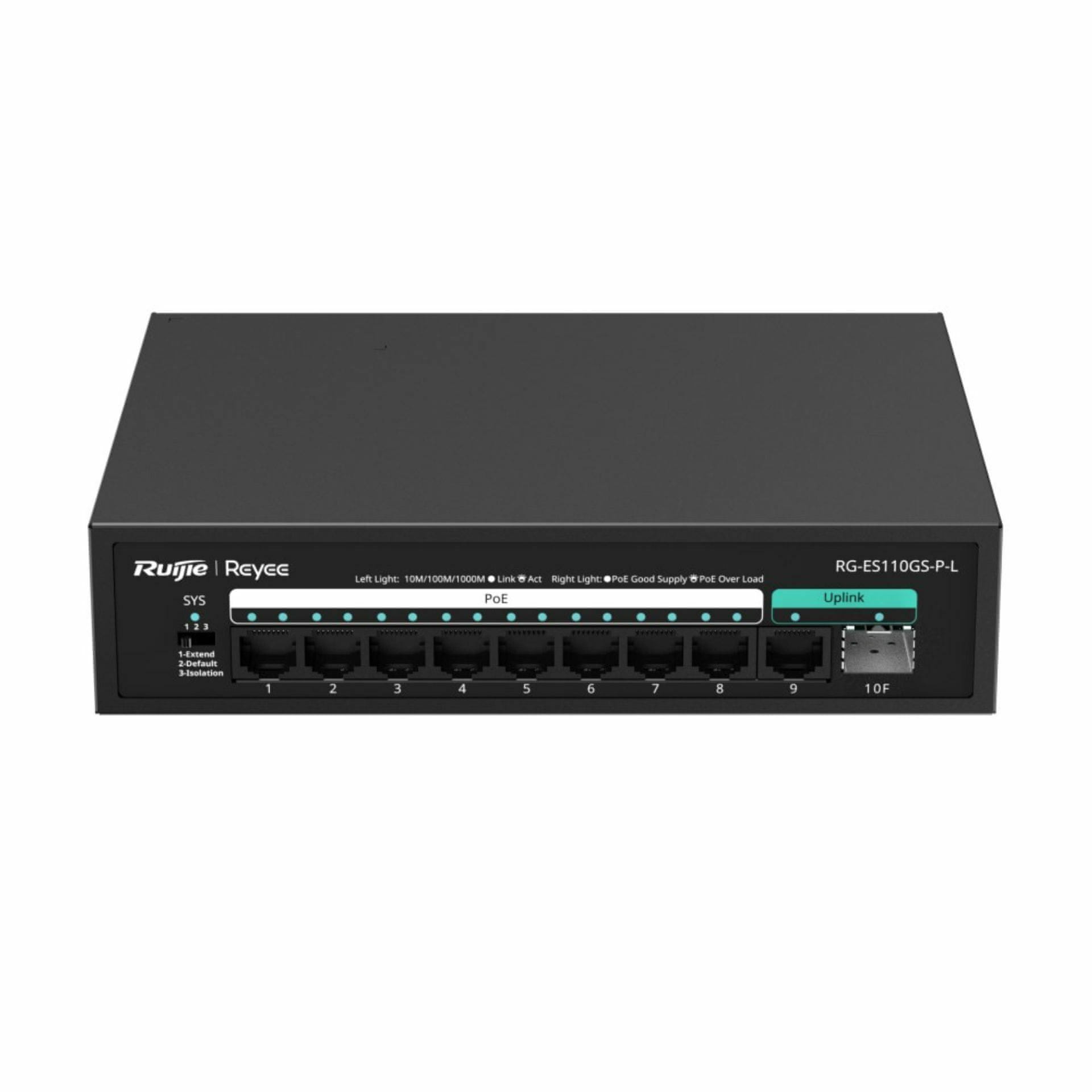 Ruijie RG-ES110GS-P-L 9-portni Gigabit switch s ukupnom snagom osam PoE izlaza 120W. Ima dva Gigabit uplinka, od kojih je jedan SFP, što omogućava fleksibilnu povezivost. Switch je idealan za tvrtke, ugostiteljstvo, tvornice, obrazovne ustanove, trgovine i nadzorne sustave.