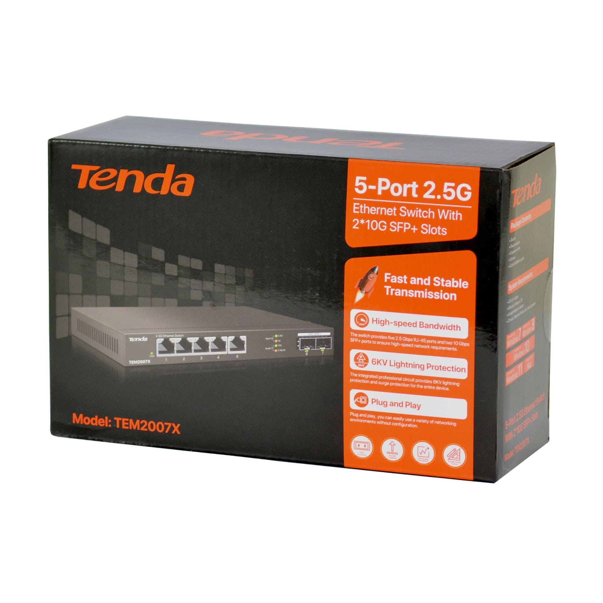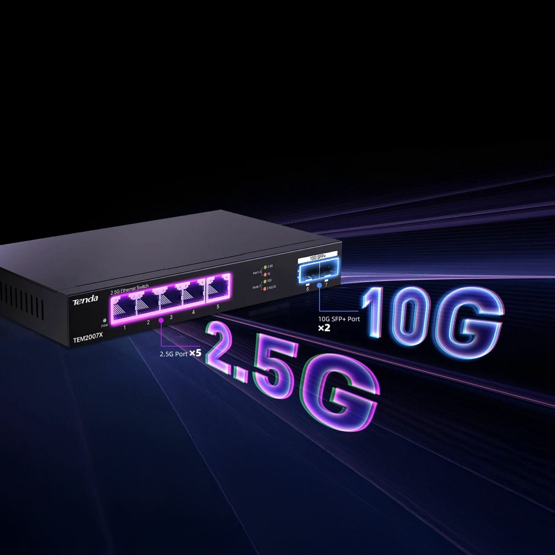 Tenda TEM2007X prekidač nudi brzinu od 2,5 gigabita na svih pet portova. U kombinaciji s dva SFP+ priključka, osigurava brži prijenos podataka i postiže iznimno nisku latenciju. Idealan je izbor za mala i srednja poduzeća, škole, male urede, za nadogradnju gigabitne mreže.