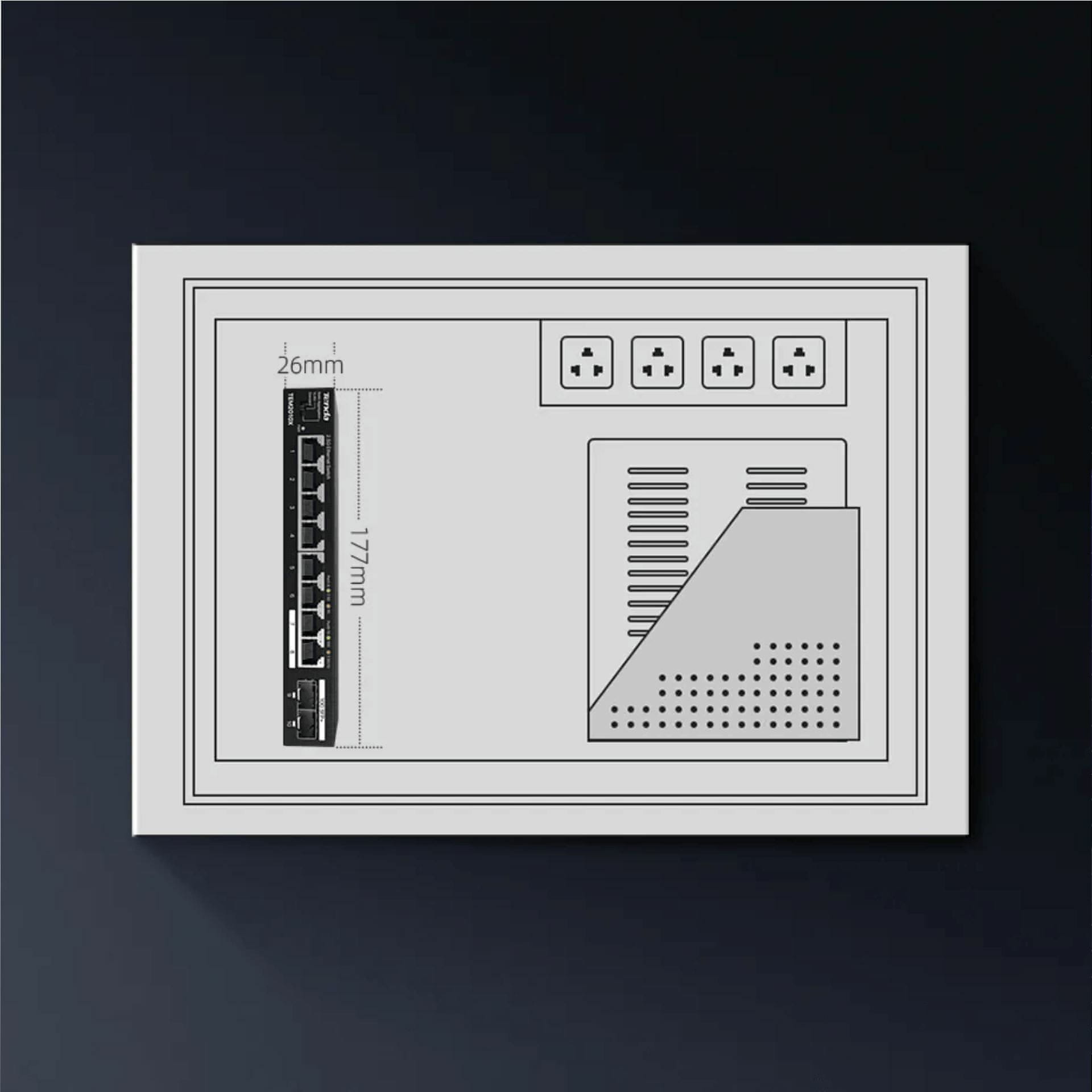 Paket vsebuje: 1× Tenda stikalo 2,5 Giga 8-port 2× SFP+ TEM2010X, 1× Napajalnik, 1× Navodila