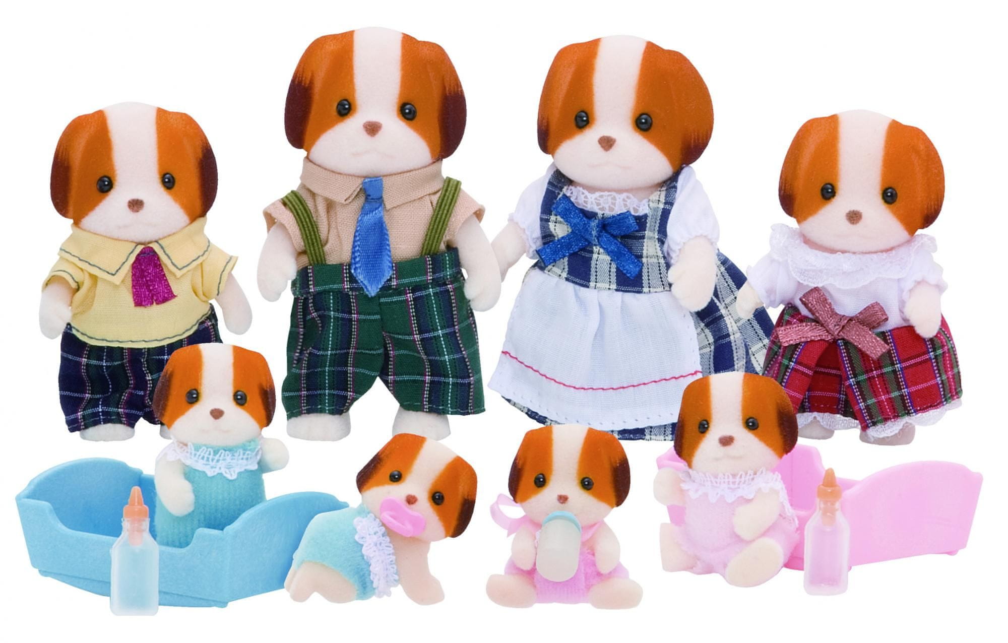 Obitelj pasa. Mama, tata i dvoje mladunaca pseće obitelji. Djeca mogu sastaviti vlastitu priču iz svijeta Sylvanian Family. Možete skinuti odjeću s figura i ponovno ih obući.