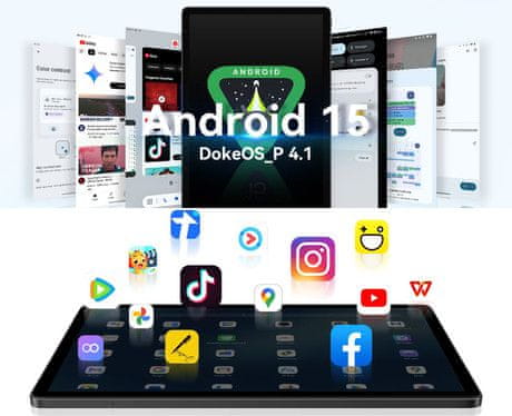 | Značajke i funkcije: | Doke AI funkcionalnost (ChatGPT + DeepSeek + Google Gemini), proširivi RAM s 12 GB na 36 GB, 4G LTE, Dual SIM, 5G WIFI, Bluetooth, Quad BOX zvučnici, ogromna baterija od 11.000 mAh, funkcija podijeljenog zaslona, PC način rada, unaprijed instaliran WPS paket aplikacija, metalno kućište, ultra tanki dizajn, napredna tehnologija hlađenja, prednja SONY® AI kamera od 13 MP i stražnja 50 MP, TÜV SÜD Low Blue Light certifikat, proširiva interna memorija do 2 TB, futrola/maska s funkcijom postolja, Widevine L1, pametni Google objektiv, otključavanje licem, GPS navigacija, brzo punjenje od 18 W, predučitavanje pametnih aplikacija, aplikacija EasyShare, aplikacija Hi Doki… |
