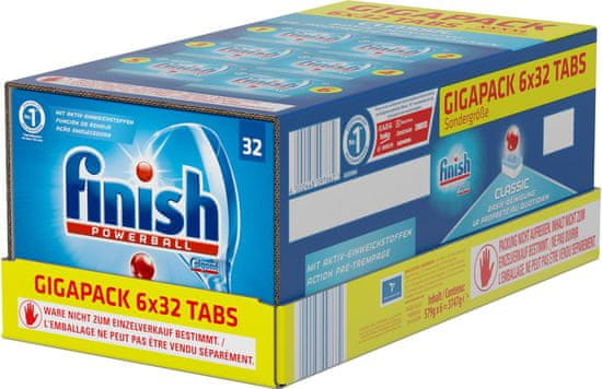 Finish Classic paket tableta sadrži 6×32 tableta za pranje. Tablete potpuno uklanjaju sve masnoće i mrlje i izvrsno su rješenje za jednostavno pranje posuđa. Imaju posebnu kuglicu s koncentriranom silom za uklanjanje sasušene hrane. Tablete štite staklo i sprječavaju koroziju i kamenac. Suđe će nakon pranja biti blještavo sjajno i čisto. Za najbolje rezultate pri kratkom programu pranja, dodajte ih na dno perilice uz filtar.