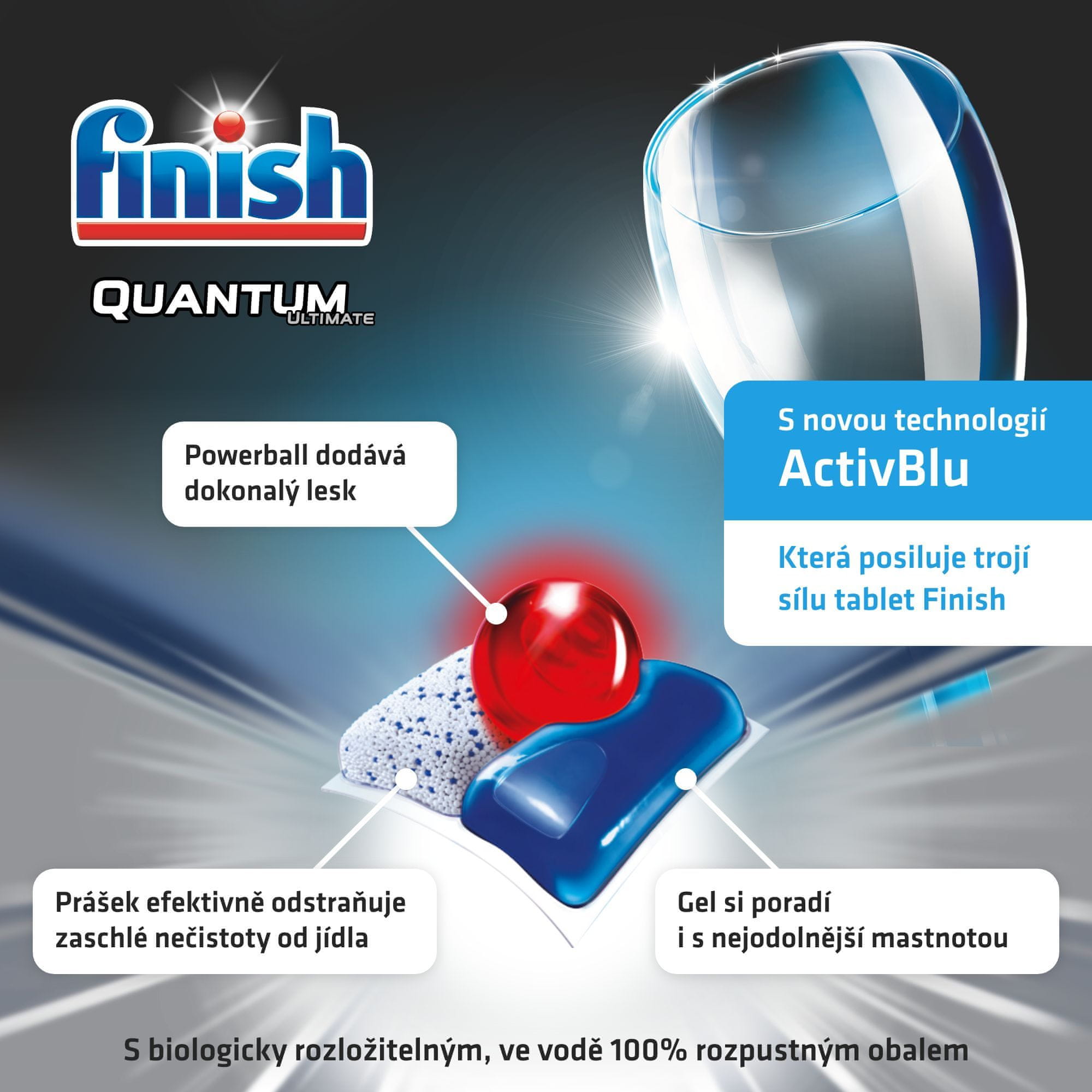 Kapsule za perilicu posuđa Finish Quantum Ultimate za nenadmašnu čistoću i sjaj. Praškasta komora učinkovito uklanja suhe ostatke hrane, powerball dodaje savršen sjaj, a gel također pobjeđuje najotporniju masnoću. Kapsule su izrađene od 100% topive biorazgradive ambalaže u vodi.