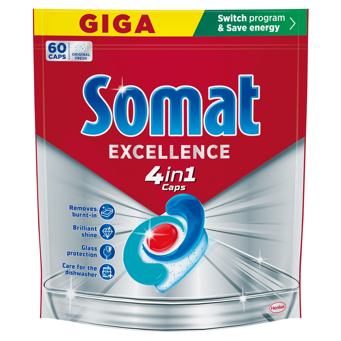 Somat Excellence tablete za perilicu posuđa pružaju dubinsko čišćenje i briljantan sjaj posuđa. Dizajnirane su s jedinstvenom kombinacijom triju komora koje sadrže gel i jedne komore koja sadrži prah. Jaka formula štiti osjetljivo posuđe, ne ostavlja mrlje od vode i njeguje perilicu posuđa.