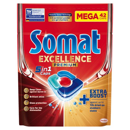 Somat Excellence tablete za perilicu posuđa pružaju posuđu dodatnu snagu u borbi protiv do 72 sata osušenih tvrdokornih mrlja, dubinskom čišćenju zagorjelih ostataka, briljantnom sjaju, zaštiti stakla i njezi perilice posuđa.