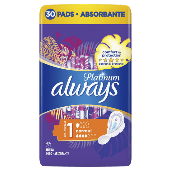 Higijenski ulošci imaju meka krila protiv iritacije kože. Tehnologija OdourLock za neutralizaciju mirisa. Always Platinum Normal (Veličina 1) Higijenski ulošci s krilima, 30 komada sadrže 1.000 mikro jastučića za veću udobnost i upijanje.
