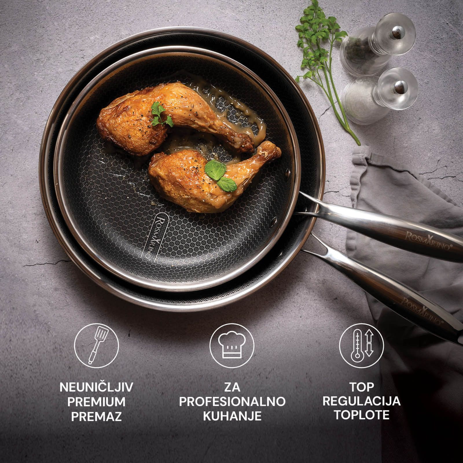 Rosmarino HexaPRO je vrhunska linija posuđa s hibridnom tehnologijom koja osigurava profesionalne rezultate, iznimnu izdržljivost, otpornost na ogrebotine te korištenje na svim površinama za kuhanje i u pećnici do 220°C.