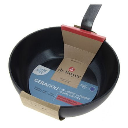CERANOA asortiman keramičkog posuđa tvrtke de Buyer je rezultat ekološkog dizajna, s bazom izrađenom od recikliranog aluminija i novim keramičkim premazom (keramički sol-gel) za koji je zajamčeno da ne sadrži PFAS. Ova keramička površina omogućuje kuhanje s malo ili nimalo masnoće. Pruža iznimnu kliznu površinu i lako se čisti. Površina je neprianjajuća i ima izvrsnu otpornost na ogrebotine. Proces kovanja povećava otpornost čvrstog tijela posuđa na deformacije i udarce te pruža dodatnu zaštitu od pregrijavanja premaza. Ova konstrukcija osigurava učinkovitu i ravnomjernu raspodjelu topline. Certificirana proizvodnja od recikliranog aluminija. Idealno za kuhanje osjetljive hrane poput ribe, povrća, mahunarki, žitarica ili zgušnjavanja umaka bez utjecaja na okus, boju ili aromu. Ova keramička tava namijenjena je za upotrebu na