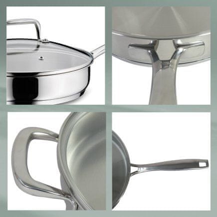 - visokokvalitetni nehrđajući čelik 18/10 – izvrsna svojstva za kuhanje, prženje, pirjanje i pečenje – dimenzijski stabilno posuđe s čvrstom konstrukcijom koja se može puno zagrijati – višeslojno.