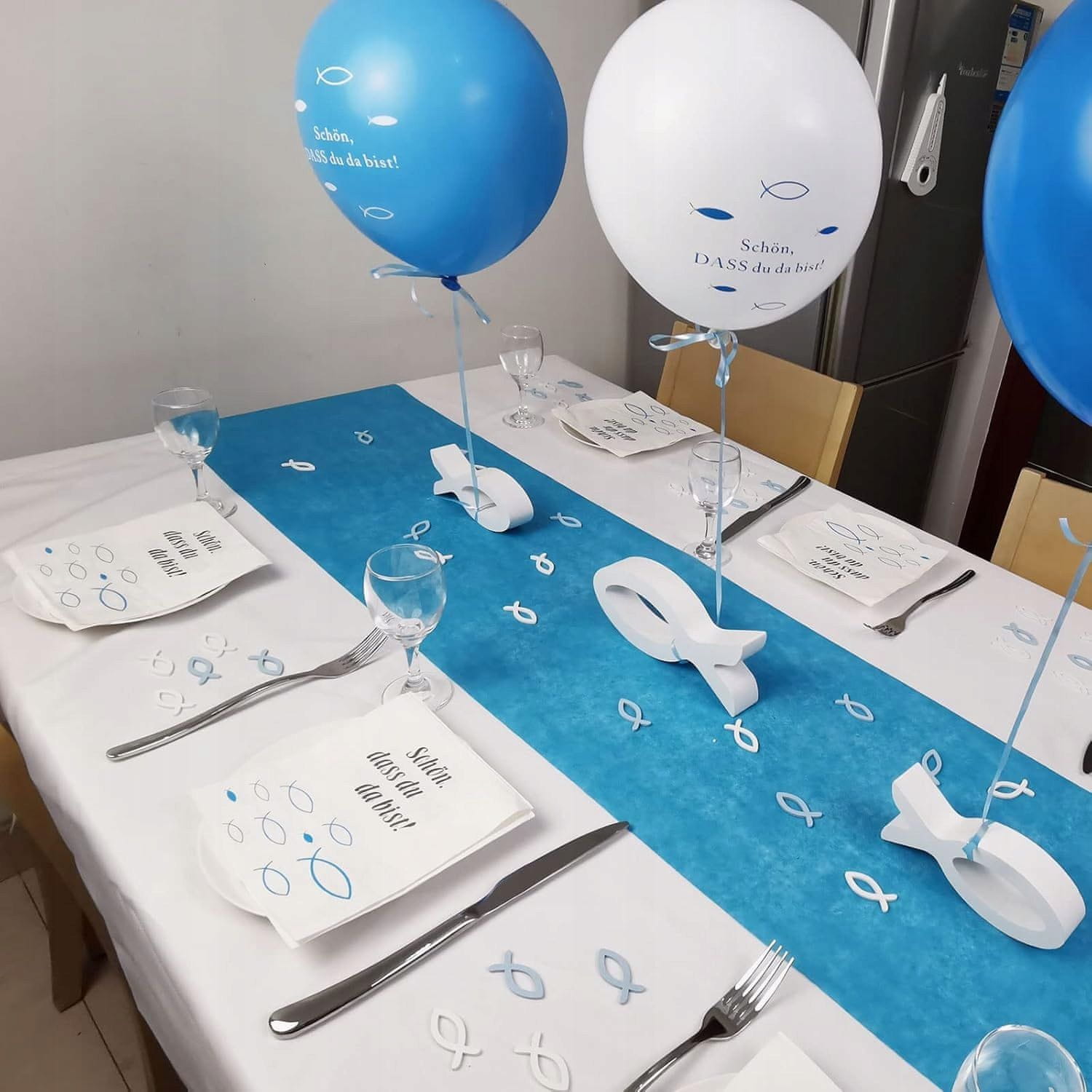 Nikcorp Set za dekoraciju Riba, 98 komada, za krštenje i pričest, salvete, baloni i drvene ribice, plavo-bijeli